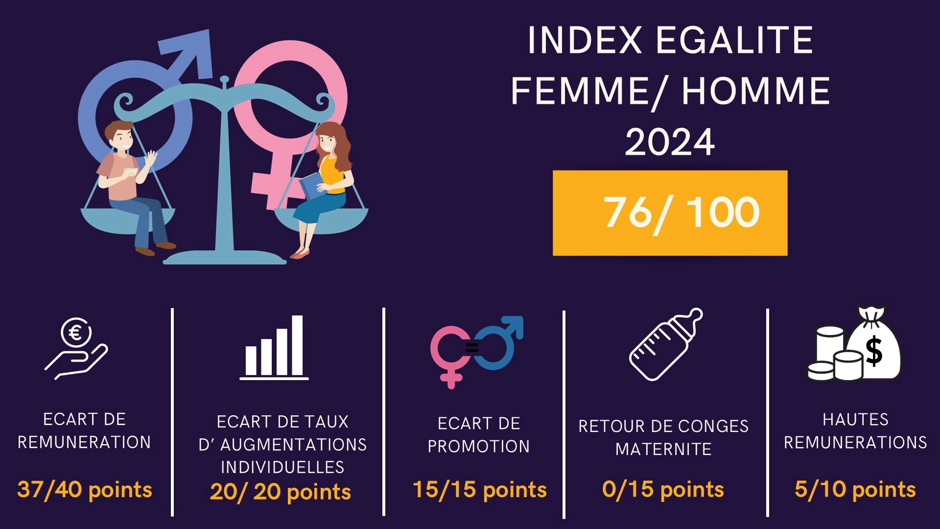 Conformément à la loi n°2018-771 du 7 septembre 2018, dite « loi avenir professionnel », L’UES 5àsec a calculé son index d’égalité salariale entre les femmes et les hommes. Pour l’année 2024, l’indice de l’UES est de 76 points sur 100 .