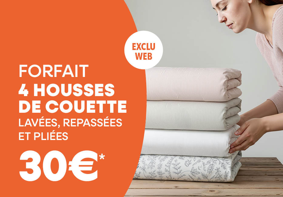 Pour seulement 30€, profitez de votre forfait pressing housses de couette 5àsec : 4 housses impeccablement lavées, repassées et pliées avec soin.